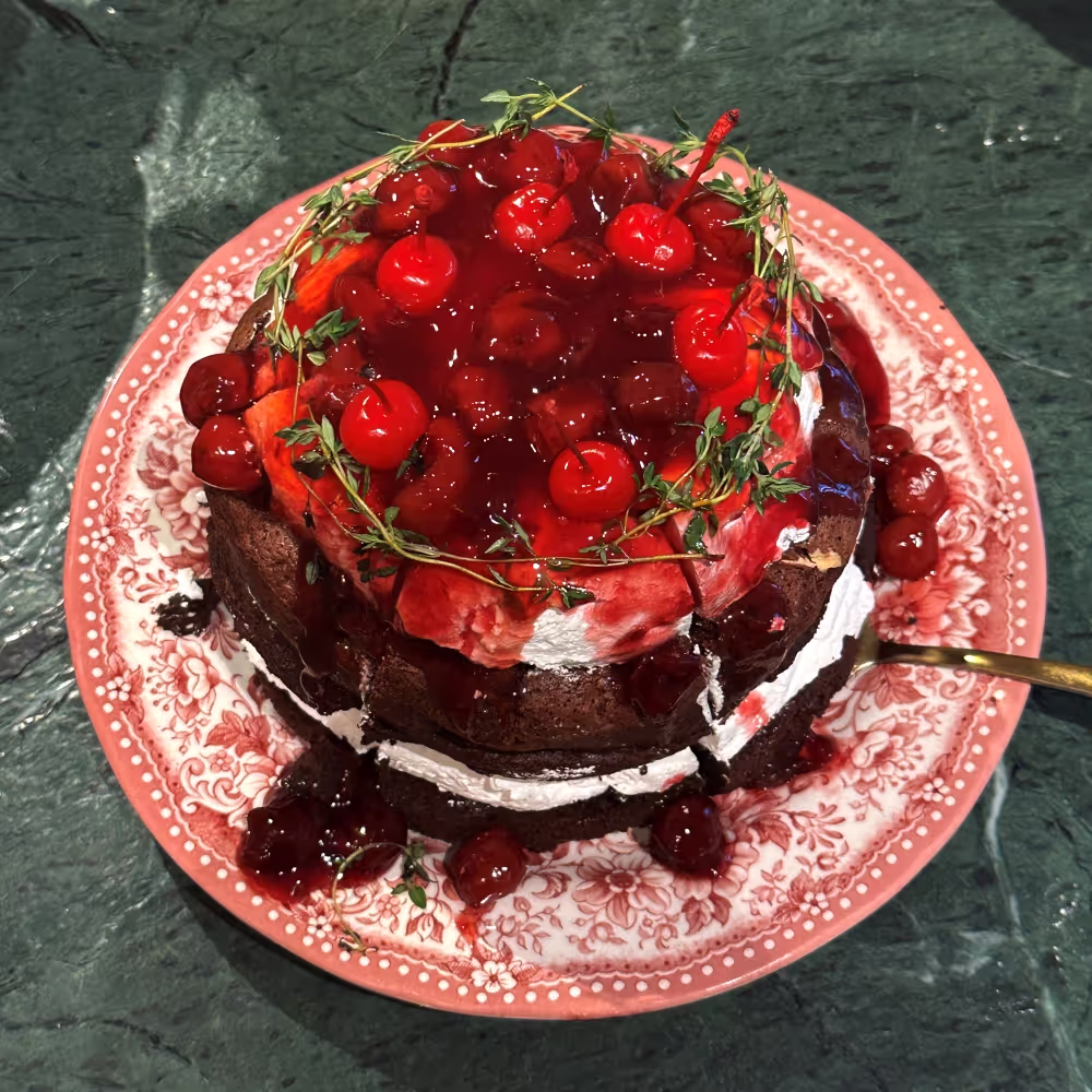 수플레 쇼콜라 케이크 위에 체리가 듬뿍 올려진 체리 쇼콜라 케이크를 드셔보세요 🍒